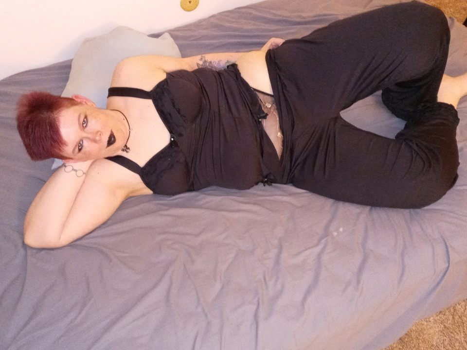 I was laying in bed. . I was super horny and needed relief. I took my black pants off but was so in the moment didn't take my thong off. I played with my wet pussy till I came so hard.